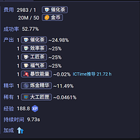 会显示单次耗时、茶耗时、催化剂影响、副产物抵扣等细节