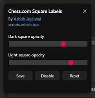 Displays algebraic square labels (a1–h8) directly on the chessboard, with adjustable opacity and a draggable control panel.