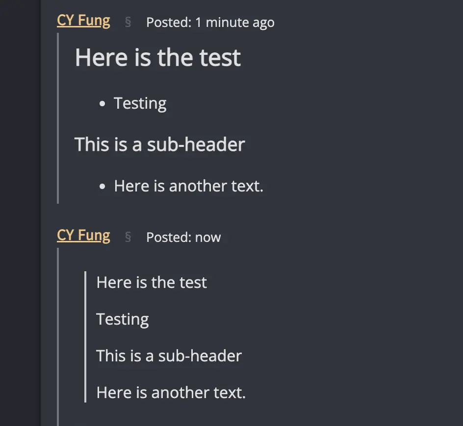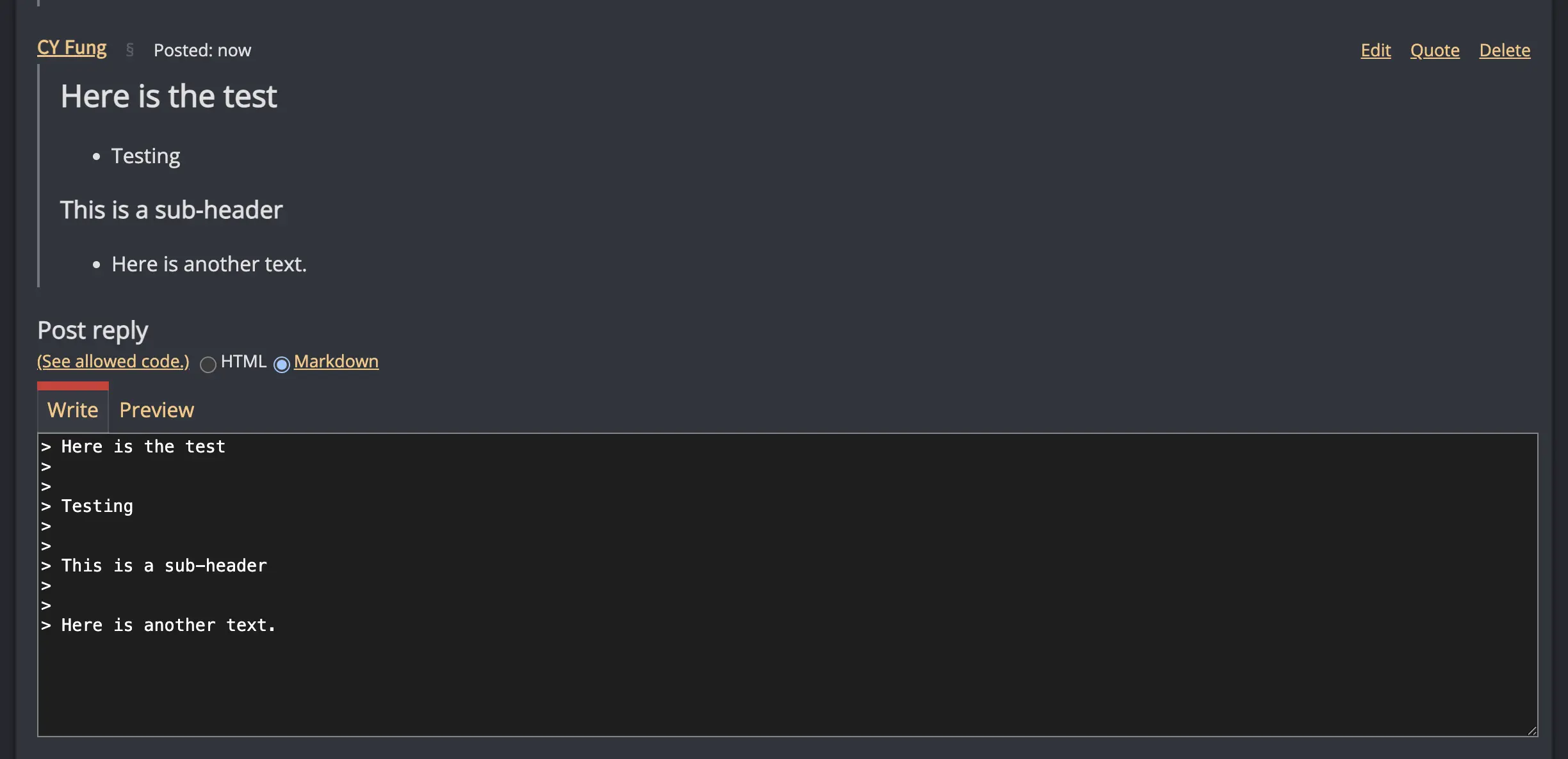 For example, user A posted something in markdown, then I am using the markdown too. Why it has to be converted to html and then I quote it in html to type and send as markdown.