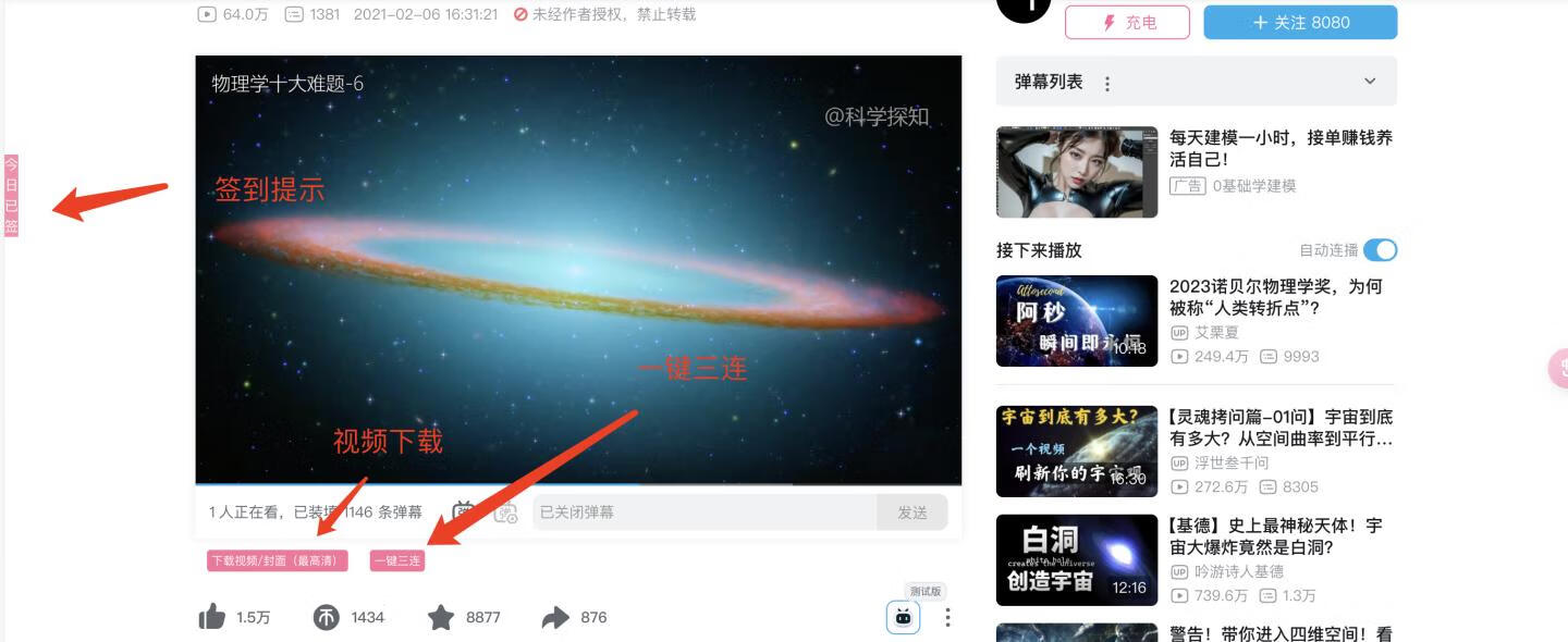 为爱发电,B站视频下载(👉支持多P批量快速下载👈)、浏览记录提示、一键三连、访问任意B站链接,即可自动签到领取瓜子辣条、视频描述中文本网址转链接,专栏文章中文本网址转链接,跳转访问更加方便等,脚本长期稳定更新,大家可以放心使用