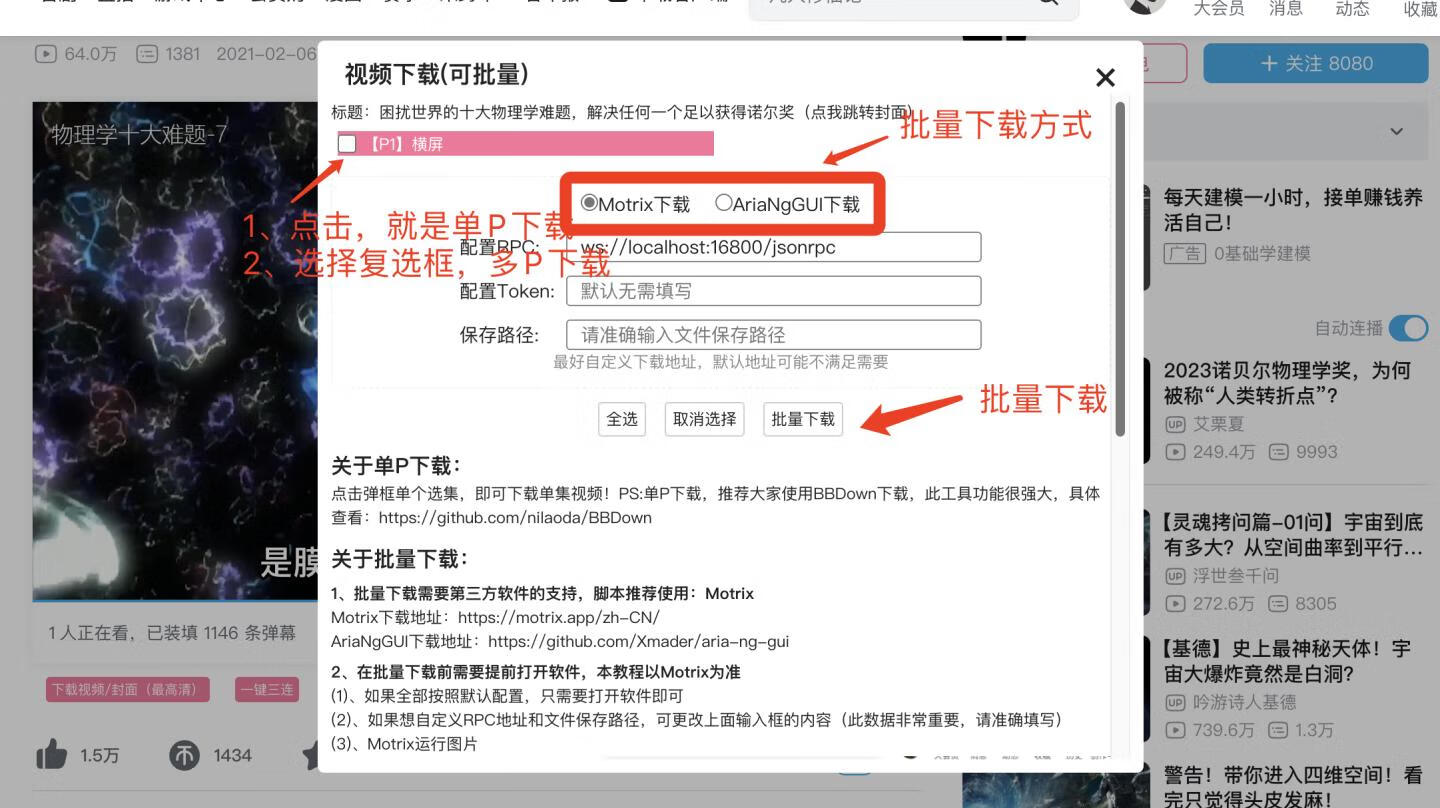 2、单P和批量下载。批量需要Motrix或Aria支持