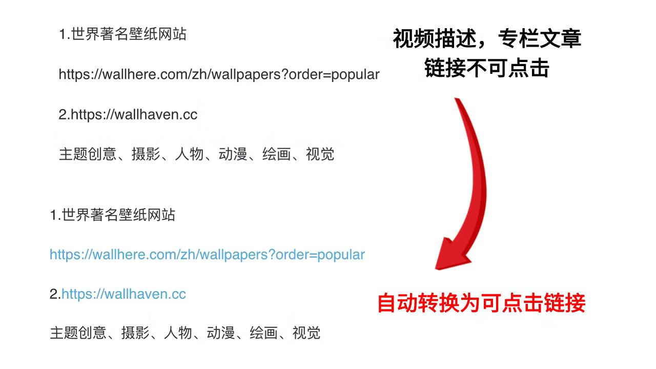 视频详情页描述和专栏文章中的网址,自动转换成可点击链接