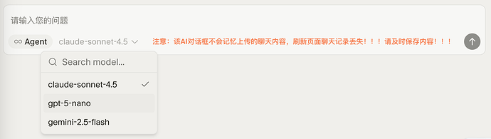 Cursor Chat(基于 Cursor 文档的聊天助手,改进了使用体验和增加易用性)支持以下模型:claude-sonnet-4.5、gpt-5-nano 和 gemini-2.5-flash。⚠️ 重要提示:不会记住上次的聊天历史!刷新页面将导致聊天记录丢失!请及时保存您的内容!