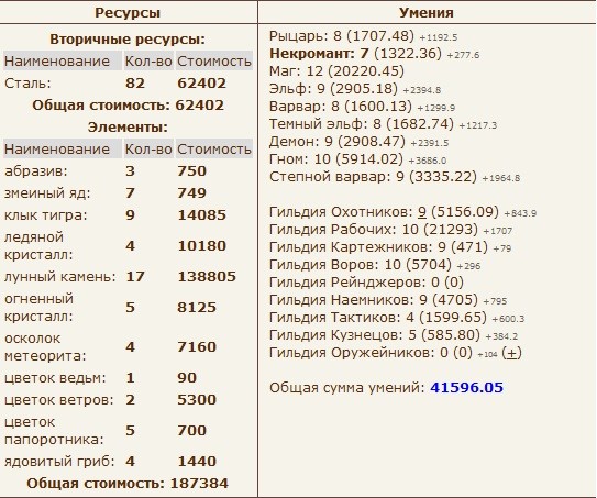 Скрипт подсчитывает стоимость элементов и/или вторичных ресурсов в инфе персонажа