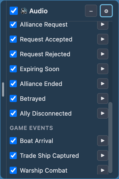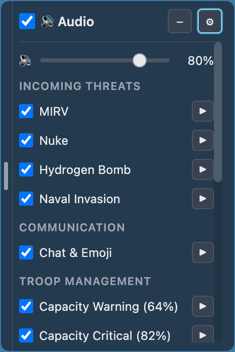 Plays audio notifications for game events: incoming threats (MIRV, Nuke, Hydrogen Bomb, Naval Invasion), chat/emoji messages, troop capacity warnings (64%/82%), alliance expiry & endings, betrayals, and boat arrivals