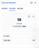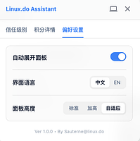 Linux.do Assistant 帮你解决这个问题——一个悬浮在页面角落的小助手,实时显示你的信任级别进度、积分余额,支持数据变化追踪,再也不用频繁切换页面了。
