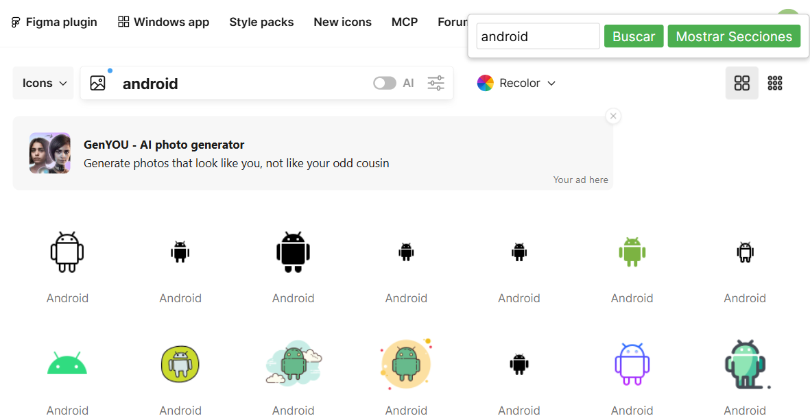 A floating search bar to filter Icons8.com/icons/set/popular page content.